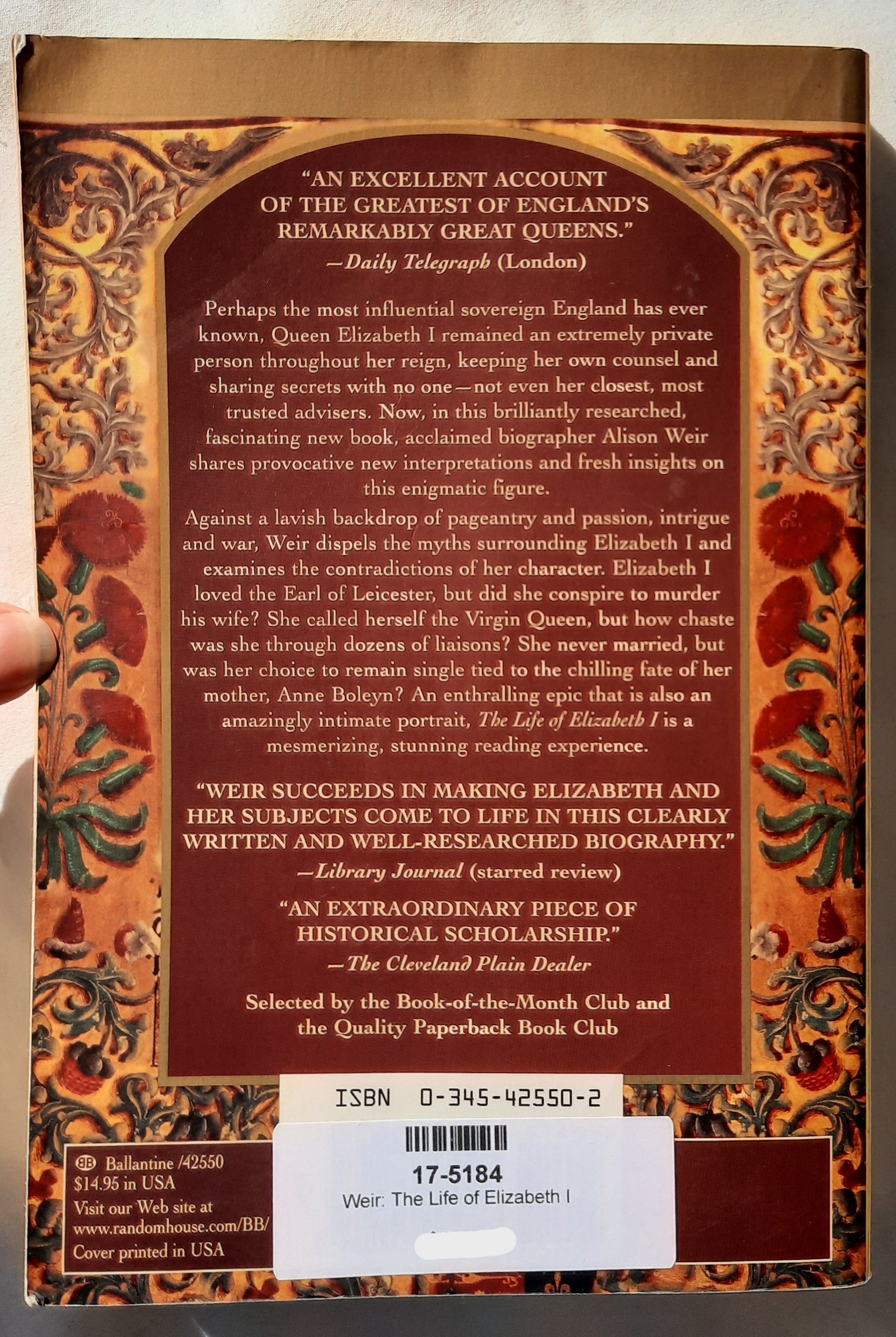 Perhaps the most influential sovereign England has ever known, Queen Elizabeth I remained an extremely private person throughout her reign, keeping her own counsel and sharing secrets with no one—not even her closest, most trusted advisers. Now, in this brilliantly researched, fascinating chronicle, Alison Weir shares provocative new interpretations and fresh insights on this enigmatic figure.