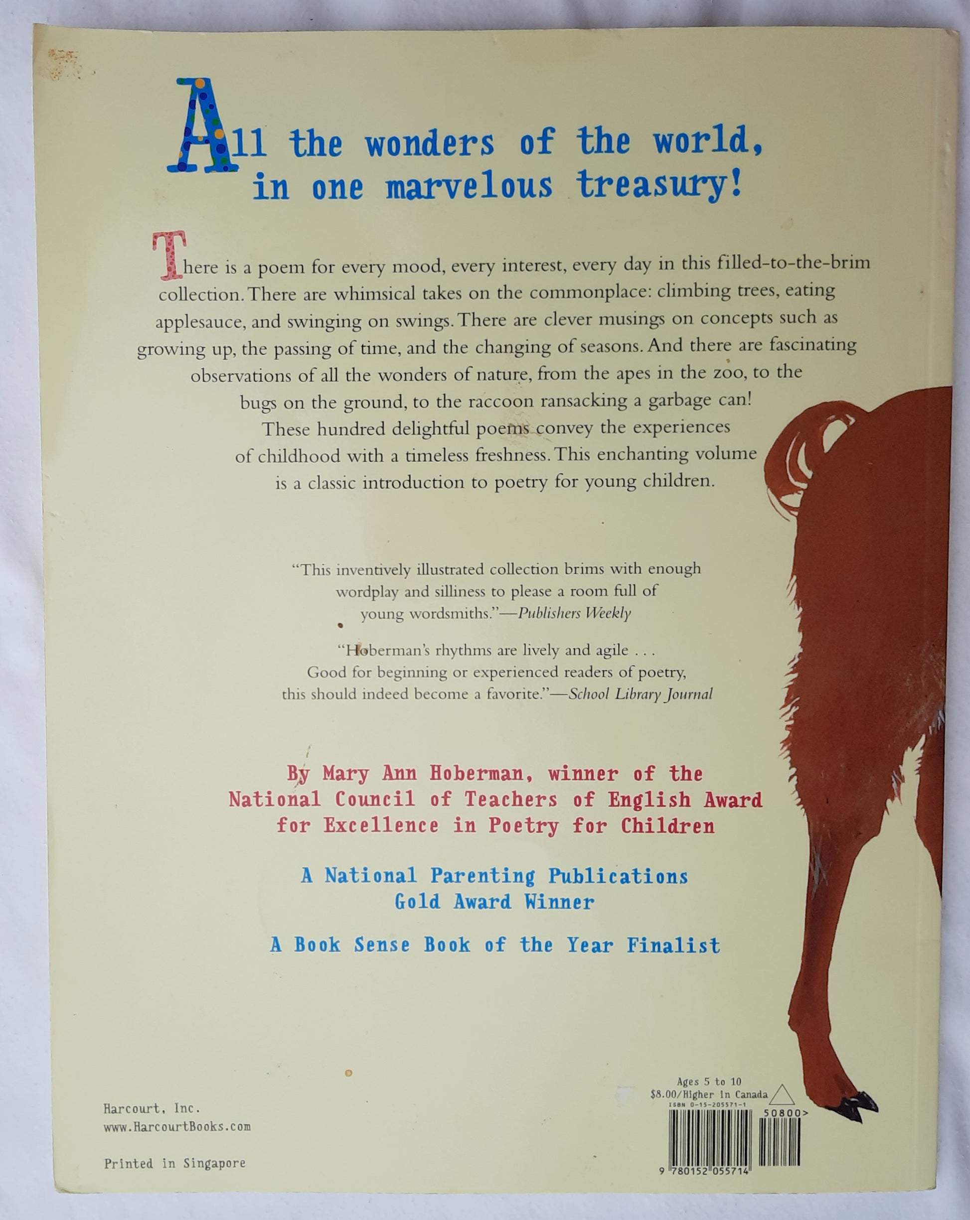 Covering everything from centipedes to whales, from swinging on swings to ice-skating in winter, from eating applesauce to celebrating birthdays, the delightful poems in this extensive collection convey the experiences of childhood with a fresh timelessness