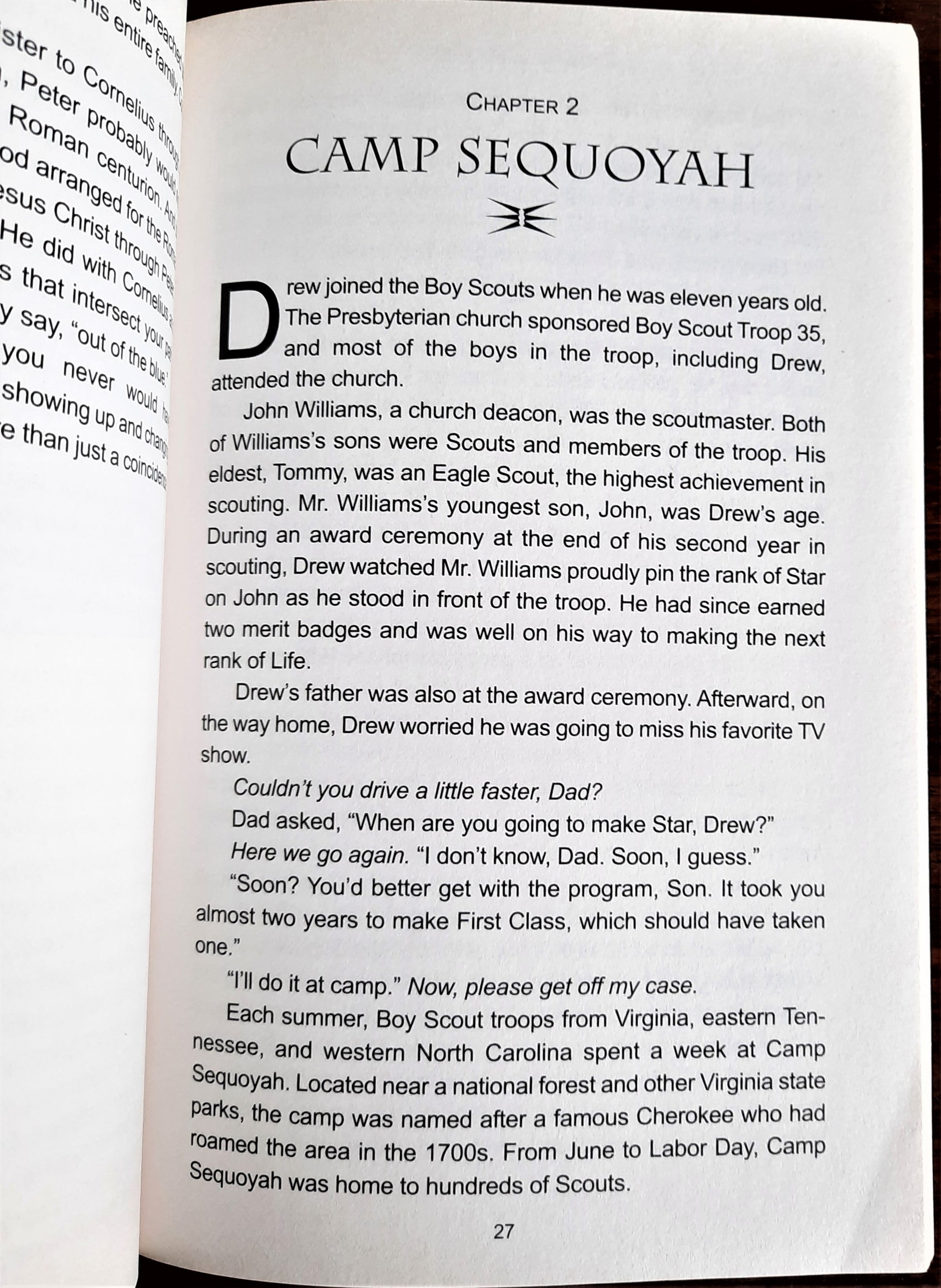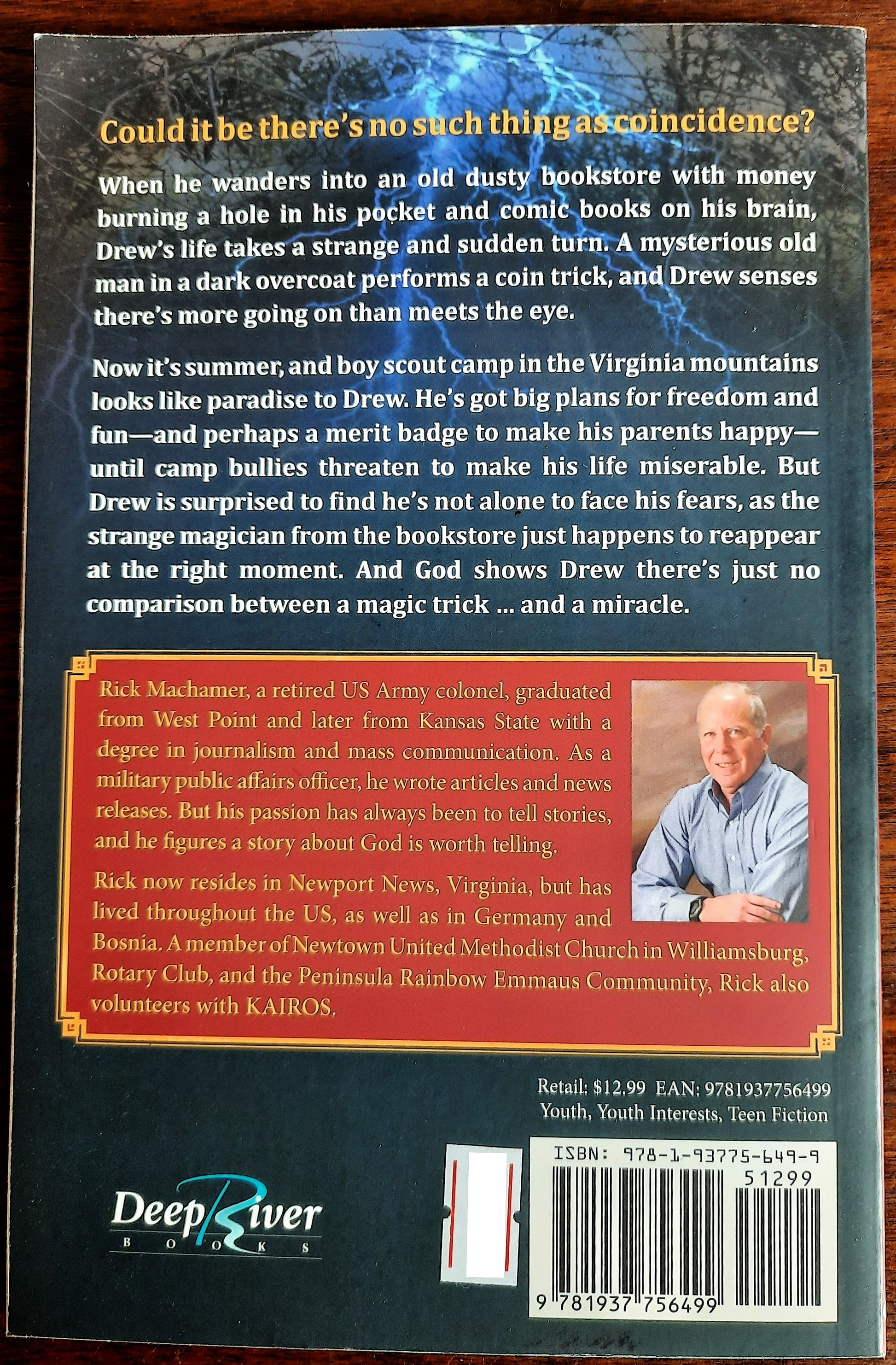 Wandering into an old dusty bookstore, with money burning a hole in his pocket and comic books on his brain, Drew’s life takes a strange and sudden turn. When a mysterious old man in a dark overcoat performs a coin trick, Drew senses there’s something more going on than meets the eye. Now it’s summer and boy scout camp in the Virginia mountains looks like paradise to Drew. He’s got big plans for freedom and fun—and perhaps a merit badge to make his parents happy—until camp bullies threaten to make his life miserable.