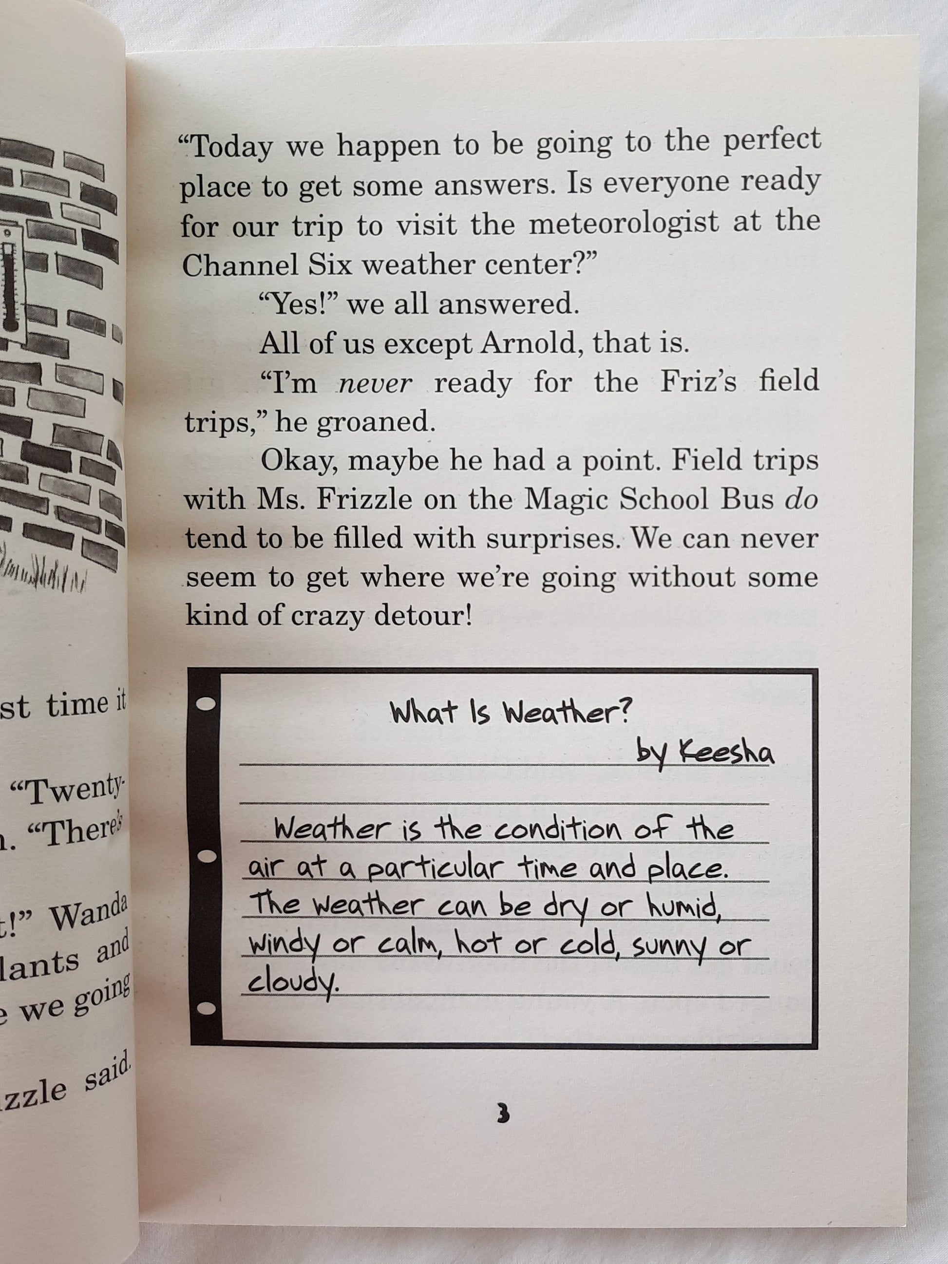 Hi, I'm Keesha -- one of the kids in Ms. Frizzle's class. When Ms. Frizzle announced that we'd be studying the weather, I thought it would be pretty boring. Boy, was I wrong! Ms. Frizzle promised to take us on a field trip that would give us a real jolt of excitement -- little did we know what we had in mind. Before we knew it, we'd become a bolt of lightning and we were off on an electrifying adventure!