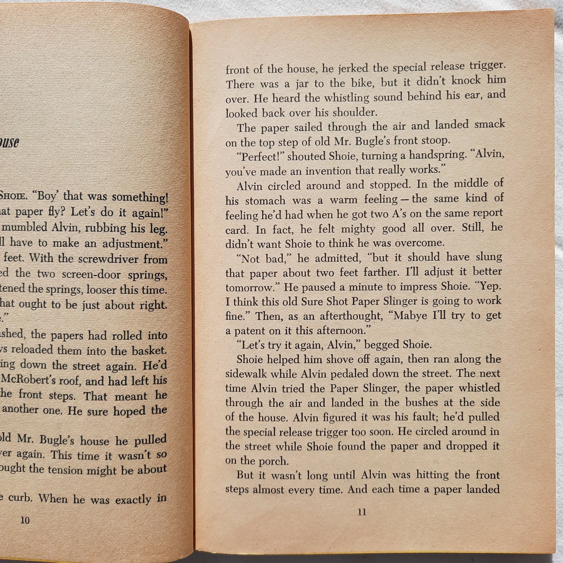 Maybe it's the Foolproof Burglar Alarm for his bedroom door, or a Sure Shot Paper Slinger for delivering newspapers from his bike. Or a Portable Fire Escape, very handy when it comes time to crawl out the window for a secret meeting with his best pal, Shoie. No doubt about it, as his sister the Pest says, "Alvin is a genius!"