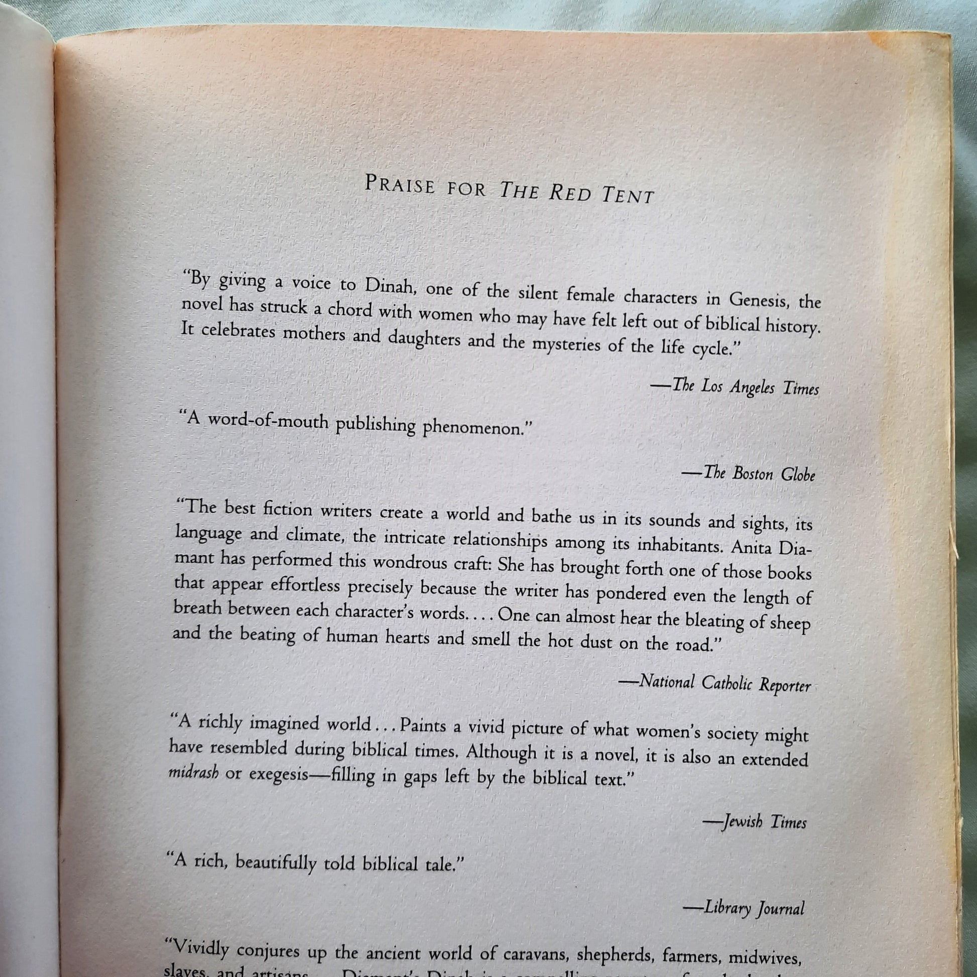 Her name is Dinah. In the Bible, her life is only hinted at in a brief and violent detour within the more familiar chapters of the Book of Genesis that are about her father, Jacob, and his dozen sons. Told in Dinah's voice, this novel reveals the traditions and turmoils of ancient womanhood--the world of the red tent.