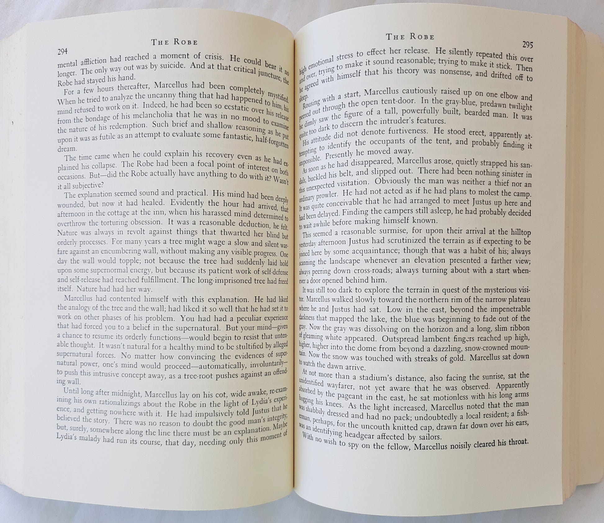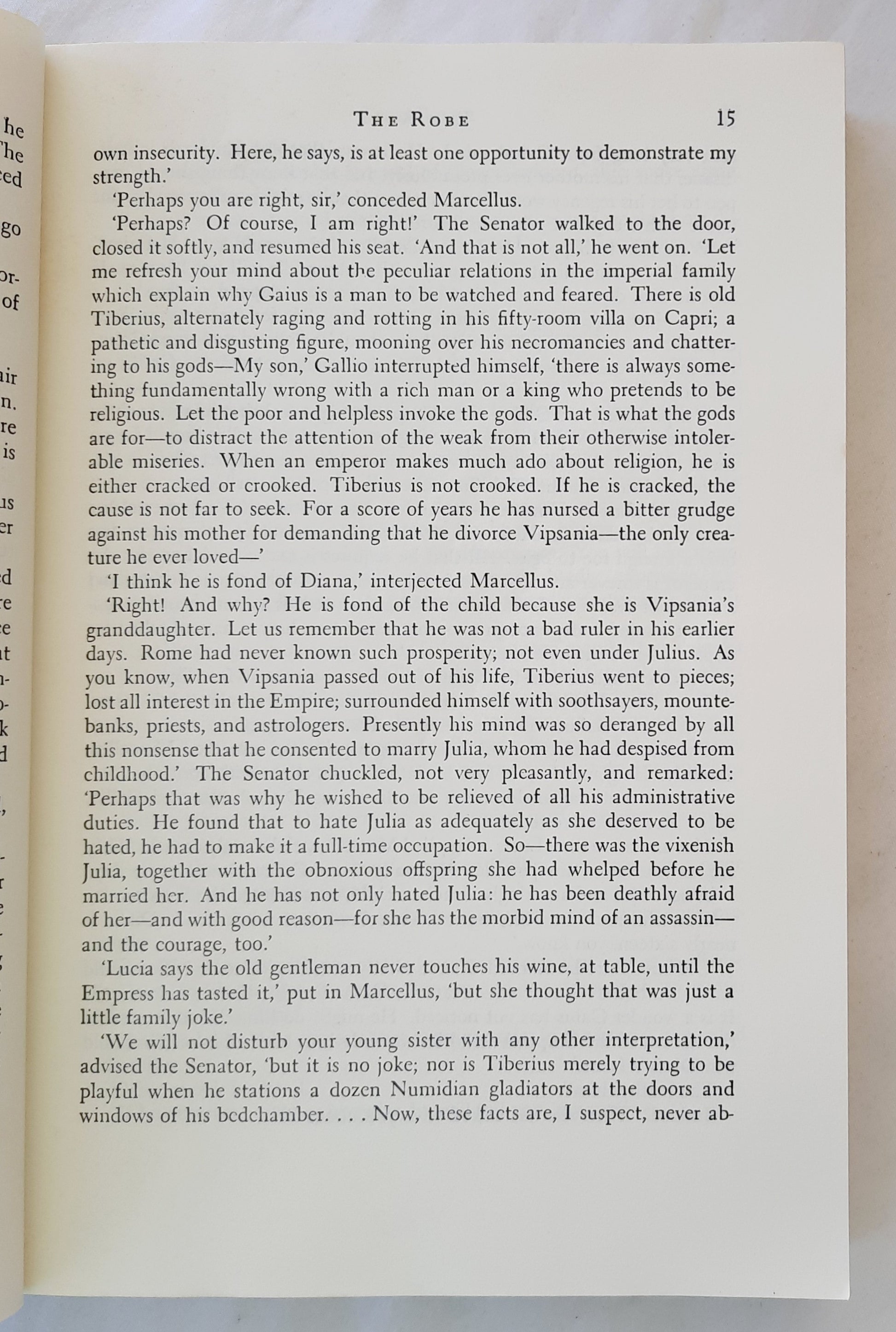 Following the crucifixion, Marcellus takes part in a banquet attended by Pontius Pilate. During the banquet, a drunken centurion insists that Marcellus wear Jesus' robe. Reluctantly wearing the garment, Marcellus apparently suffers a nervous breakdown and returns to Rome.