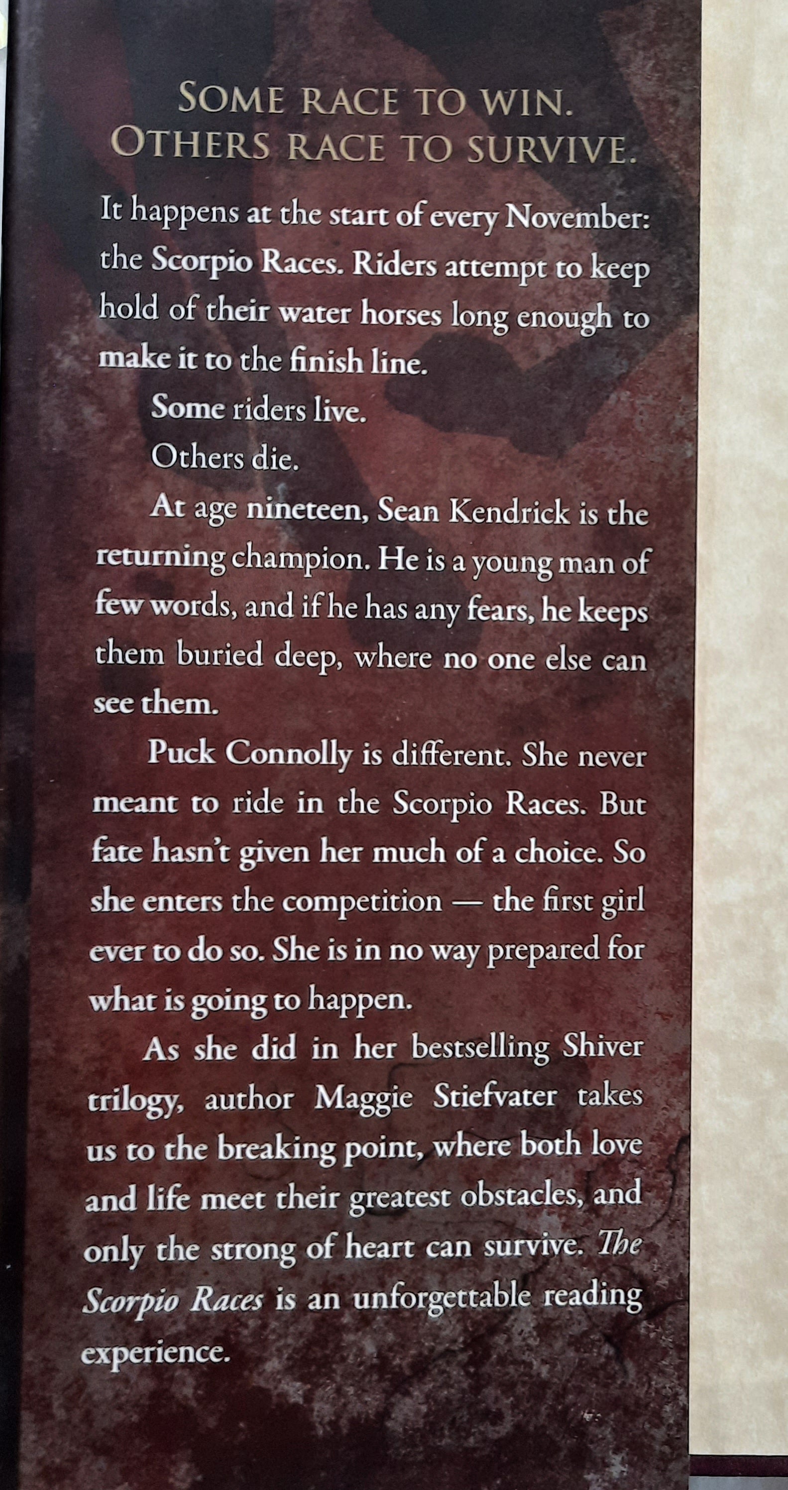 Some race to win. Others race to survive.It happens at the start of every November: the Scorpio Races. Riders attempt to keep hold of their water horses long enough to make it to the finish line. Some riders live. Others die. At age nineteen, Sean Kendrick is the returning champion. He is a young man of few words, and if he has any fears, he keeps them buried deep, where no one else can see them. Puck Connolly is different. She never meant to ride in the Scorpio Races. But fate hasn't given her much of a choice. So she enters the competition - the first girl ever to do so. She is in no way prepared for what is going to happen. As she did in her bestselling Shiver trilogy, author Maggie Stiefvater takes us to the breaking point, where both love and life meet their greatest obstacles, and only the strong of heart can survive. The Scorpio Races is an unforgettable reading experience.