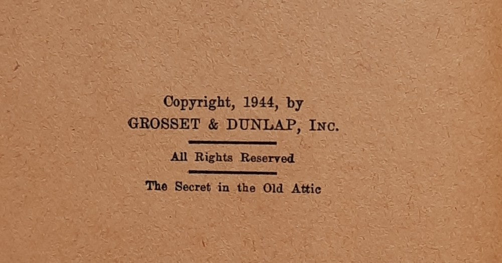 The Secret in the Old Attic by Carolyn Keene (Good, 1944, HC, 216 pages, Grosset & Dunlap)
