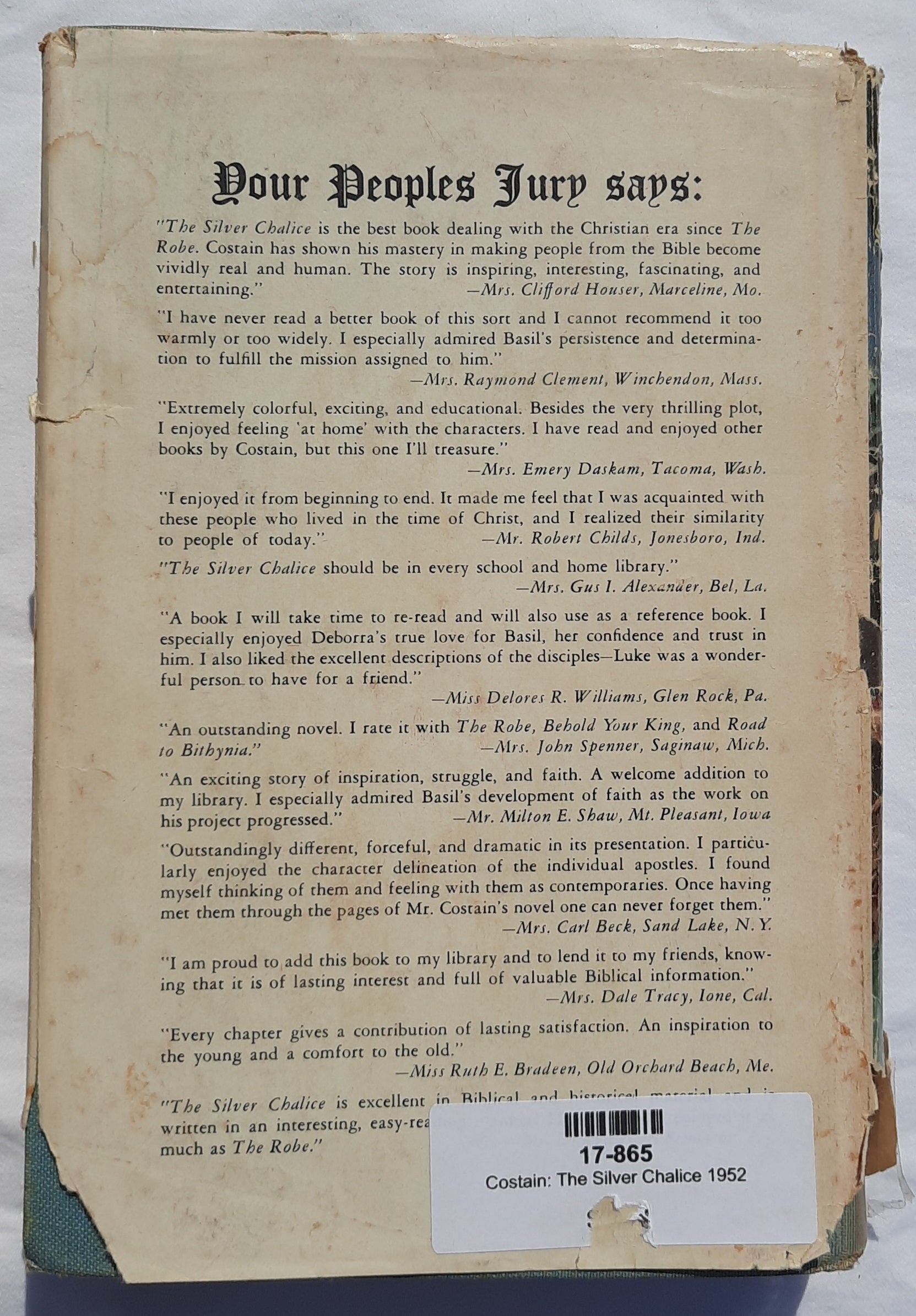 The Silver Chalice by Thomas Costain (Good, 1952, HC, 533 pages Peoples Book Club)