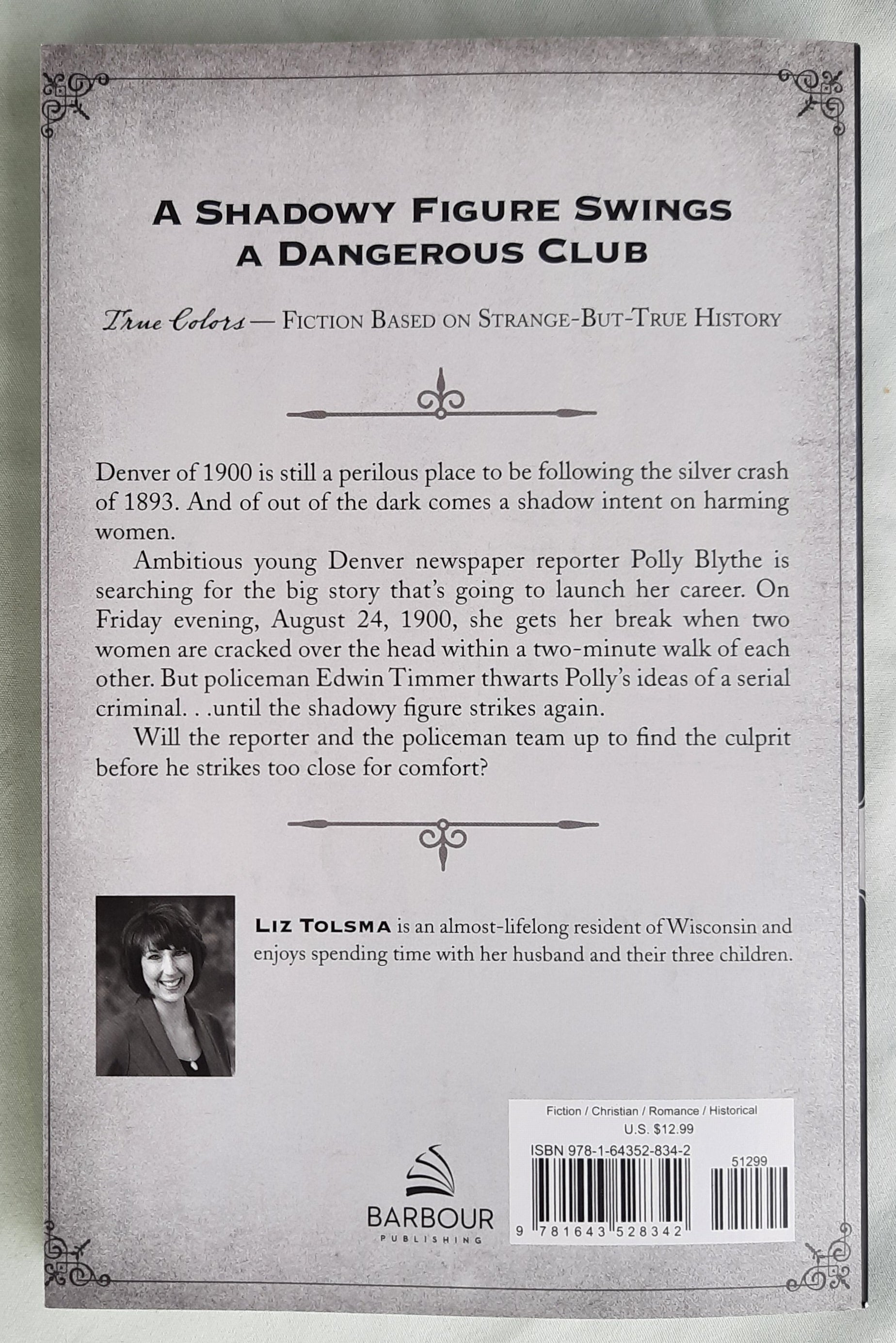 Denver of 1900 is still a dangerous place to be following the silver crash of 1893. And of out of the dark comes a shadow intent on harming women. Ambitious young Denver newspaper reporter Polly Blythe is searching for the big story that’s going to launch her career. On Friday evening, August 24, 1900, she gets her break when two women are cracked over the head within a two-minute walk of each other. But policeman Edwin Timmer thwarts Polly’s ideas of a serial criminal. . .until the shadowy figure strikes again. Will the reporter and the policeman team up to find the culprit before he strikes too close for comfort?