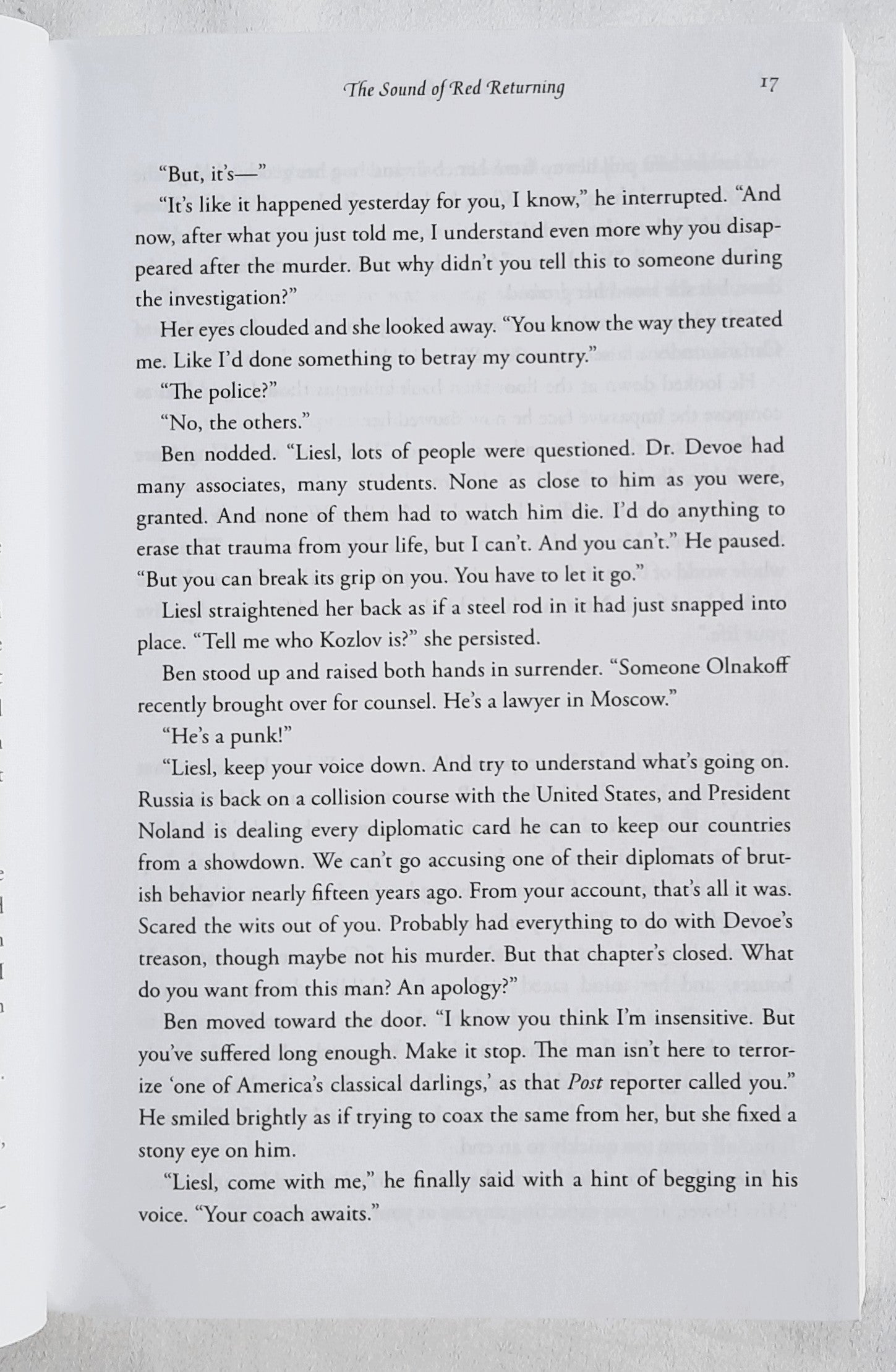 When she spots a familiar and eerie face in the audience of a concert she’s giving for the president in Washington, DC, the scariest day of her life comes back to her with a flash. It has been fifteen years since Liesl watched her beloved Harvard music mentor assaulted on a dark night in Moscow and just as long since the CIA disclosed to her that he’d been spying for Russia. She had seen that man--that eerie face--the night Professor Devoe was attacked. And now he’s back--and coming for her.