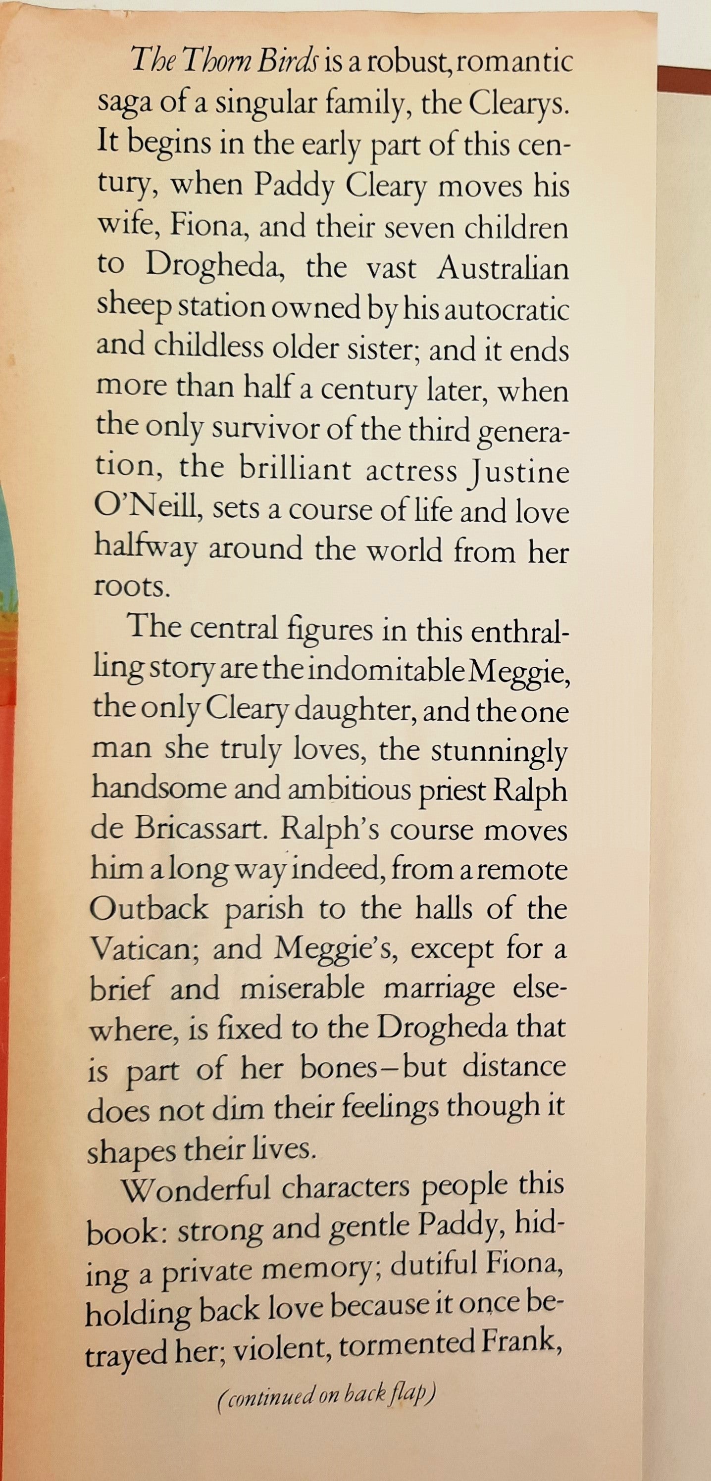 The Thorn Birds is a chronicle of three generations of Clearys—an indomitable clan of ranchers carving lives from a beautiful, hard land while contending with the bitterness, frailty, and secrets that penetrate their family. It is a poignant love story, a powerful epic of struggle and sacrifice, a celebration of individuality and spirit. Most of all, it is the story of the Clearys' only daughter, Meggie, and the haunted priest, Father Ralph de Bricassart—and the intense joining of two hearts and souls over a lifetime, a relationship that dangerously oversteps sacred boundaries of ethics and dogma.