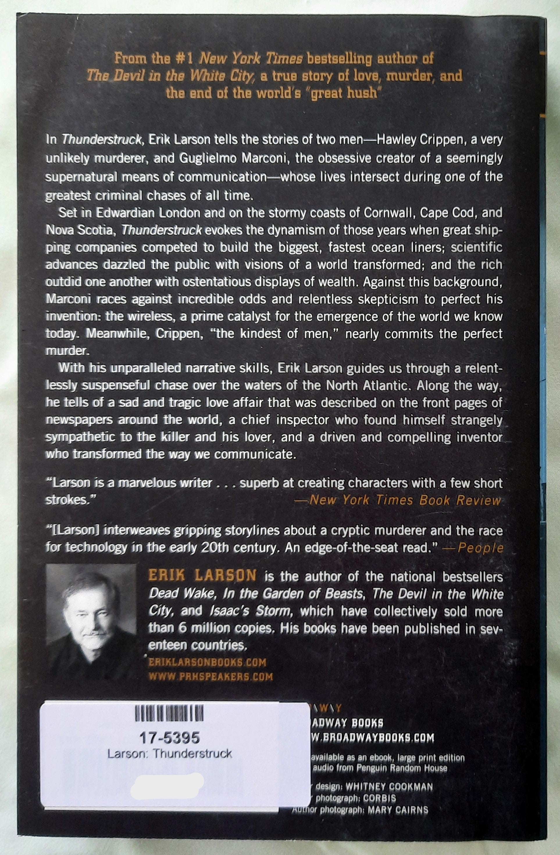 In Thunderstruck, Erik Larson tells the interwoven stories of two men—Hawley Crippen, a very unlikely murderer, and Guglielmo Marconi, the obsessive creator of a seemingly supernatural means of communication—whose lives intersect during one of the greatest criminal chases of all time.