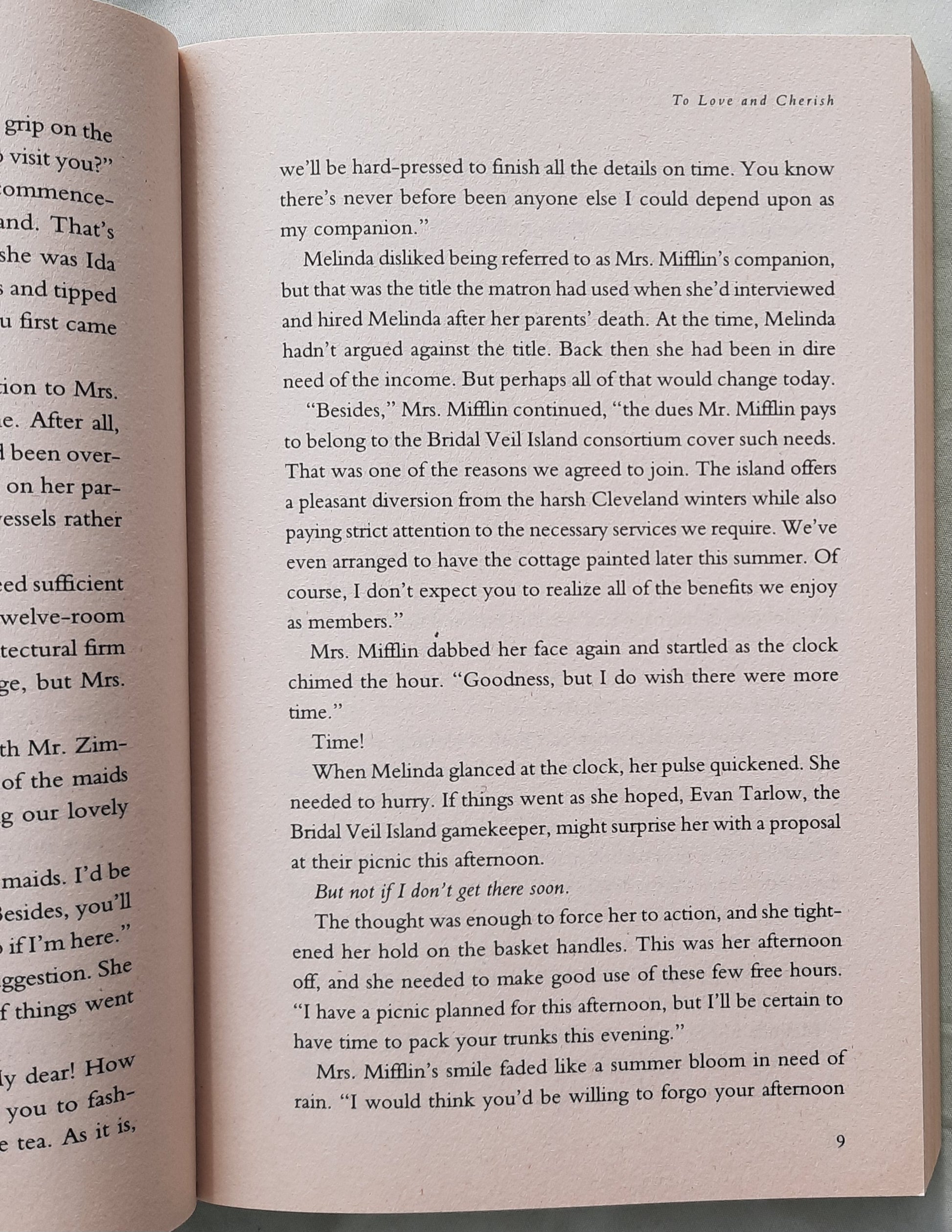 When Melinda Colson's employer announces they'll be leaving Bridal Veil Island to return to their home in Cleveland, Melinda hopes her beau, Evan, will propose. But Evan isn't prepared to make an offer of marriage until he knows he can support a wife and family. Evan works as the assistant gamekeeper on Bridal Veil but hopes to be promoted soon.