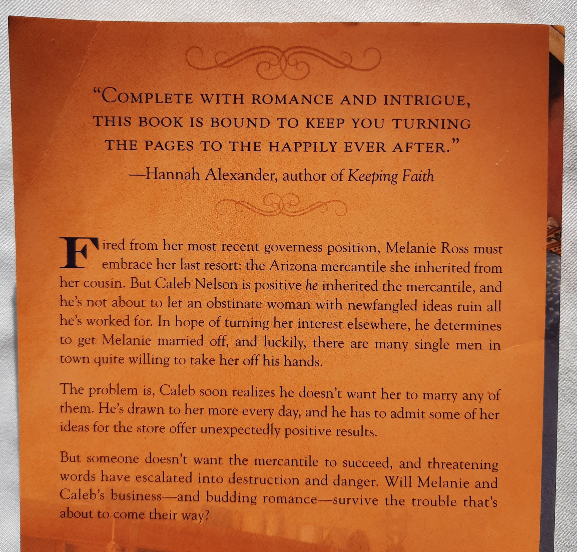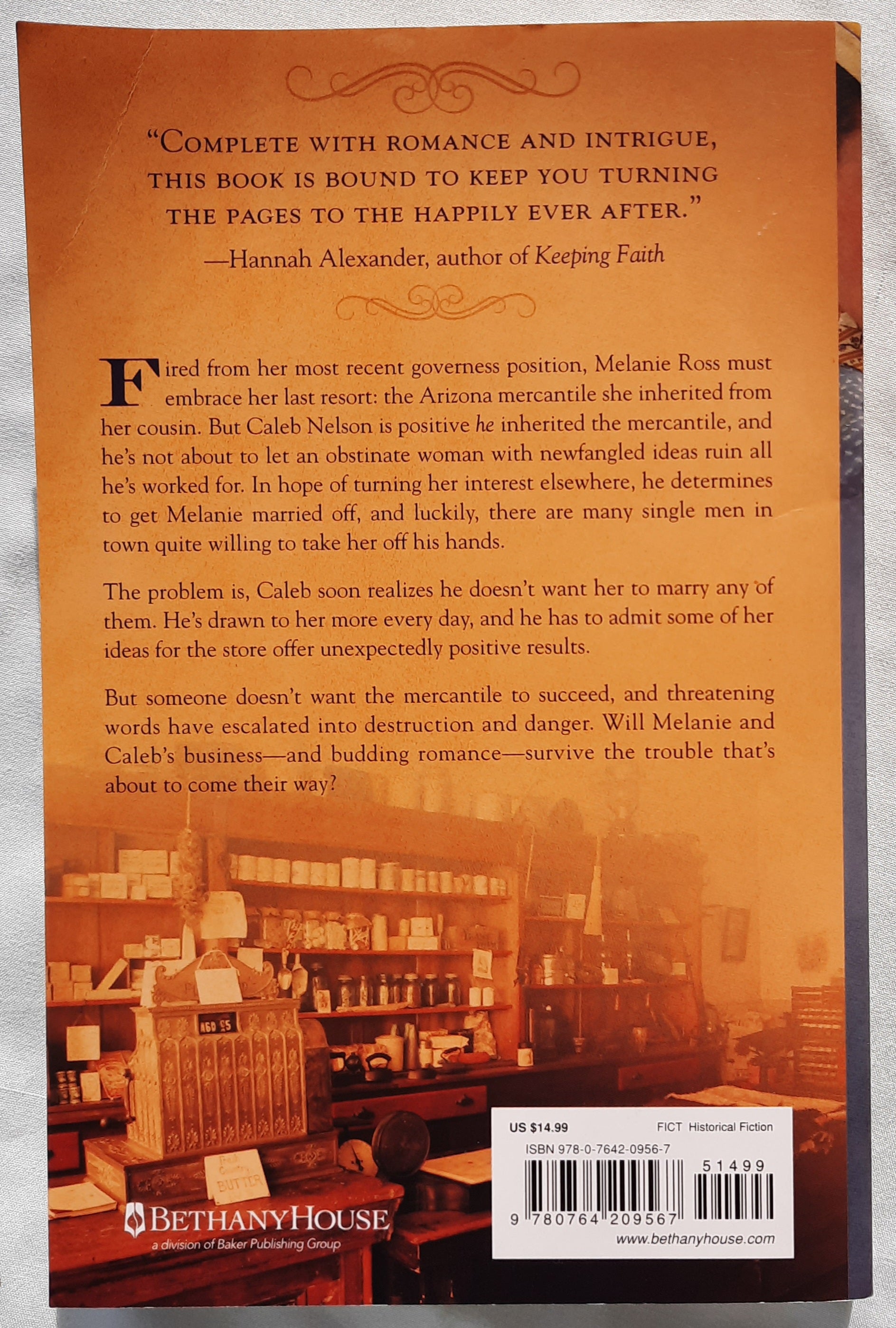 Fired from her most recent governess position, Melanie Ross must embrace her last resort: the Arizona mercantile she inherited from her cousin. But Caleb Nelson is positive he inherited the mercantile, and he's not about to let some obstinate woman with newfangled ideas mess up all he's worked for. He's determined to get Melanie married off as soon as possible, and luckily there are plenty of single men in town quite interested in taking her off his hands. The problem is, Caleb soon realizes he doesn't want her to marry up with any of them. He's drawn to Melanie more every day, and he has to admit some of her ideas for the store unexpectedly offer positive results.