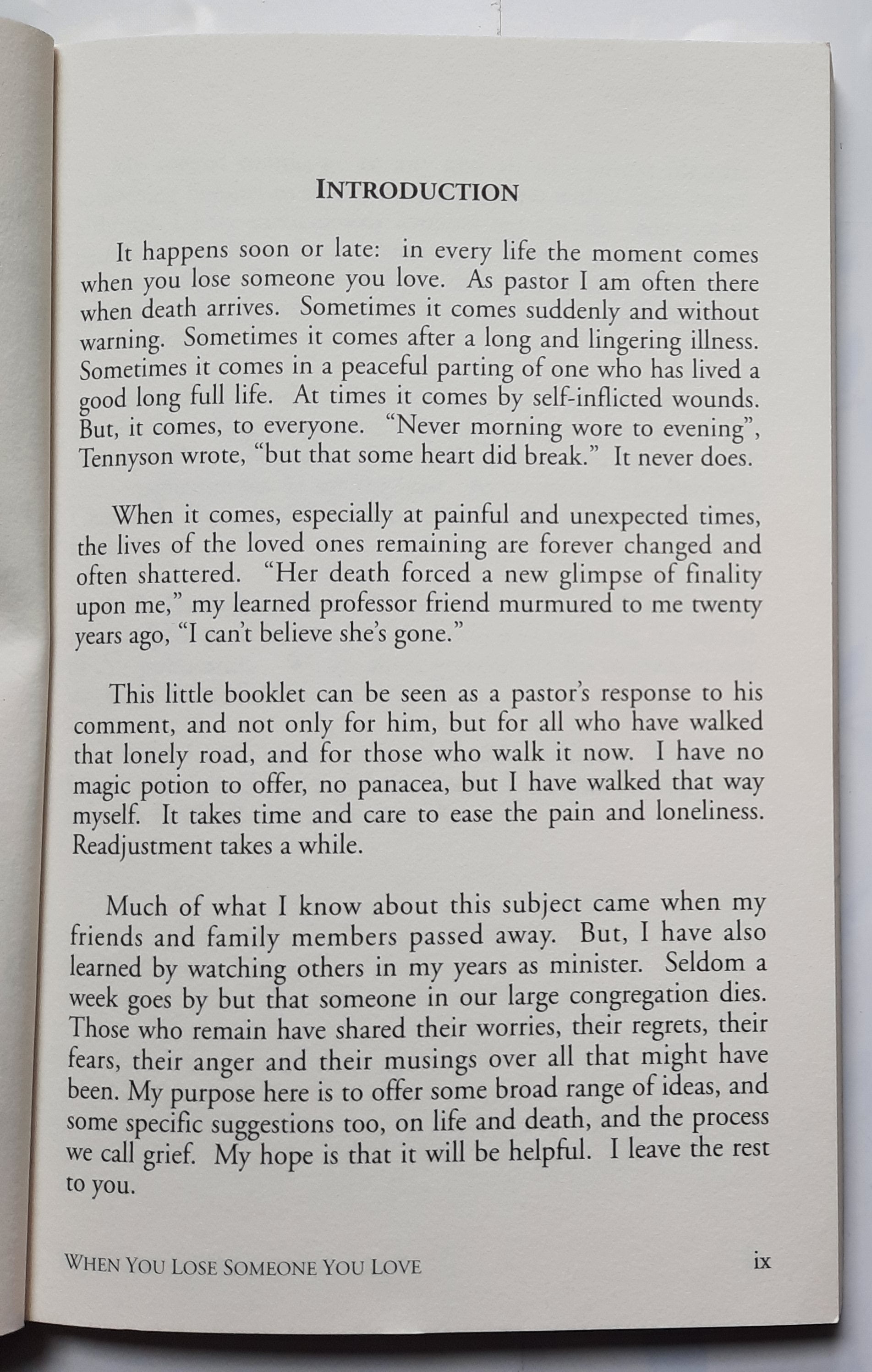 The book, When You Lose Someone You Love, by Dr. Cromie has helped thousands of people go through their individual journeys when someone they are close to has died. This is an excerpt from the It happens soon or death intrudes on every life; the moment comes for everyone when you lose someone you love. As pastor I am often there, and several times I have been there myself. Sometimes it comes suddenly and without warning. Sometimes it comes after a long and lingering illness. Sometimes it comes in a peaceful parting of one who has lived a good long full life. At times it comes be self-inflicteded wounds. Sometimes its arrival is a mystery. But it comes to everyone, young and old and to all the in-betweens.