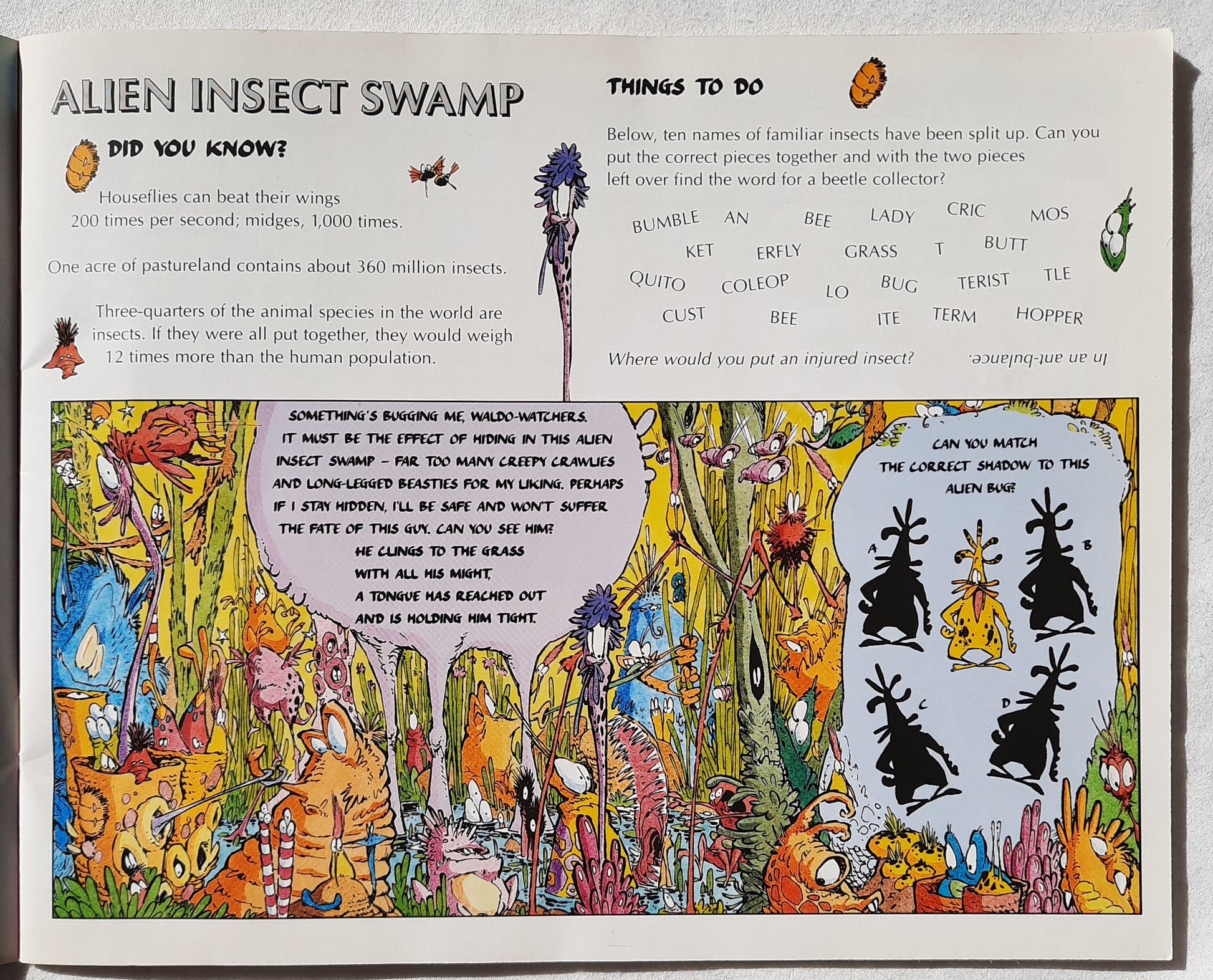 Young readers are invited to find Waldo and his friends, and a variety of other details, hidden in illustrations of environments from a swamp full of insects to a Viking camp, and to solve mazes, word squares, and other related puzzles.